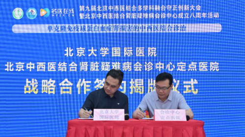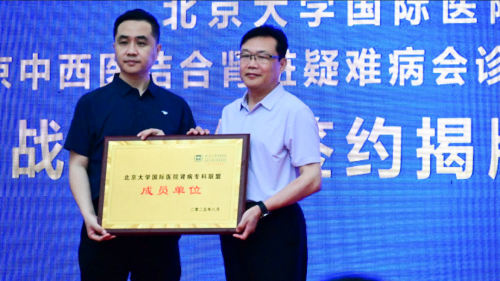 在本次活動中,舉行了北京大學(xué)國際醫(yī)院與會診中心定點(diǎn)醫(yī)院腎病??坪献骱灱s揭牌儀式。北京大學(xué)國際醫(yī)院副院長于峰教授和會診中心定點(diǎn)醫(yī)院鄧玉成院長簽約揭牌,雙方達(dá)成腎病??坪献麝P(guān)系。